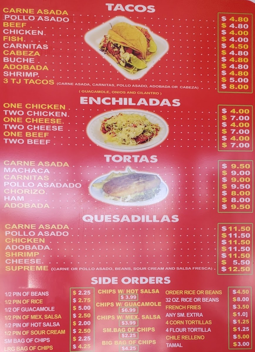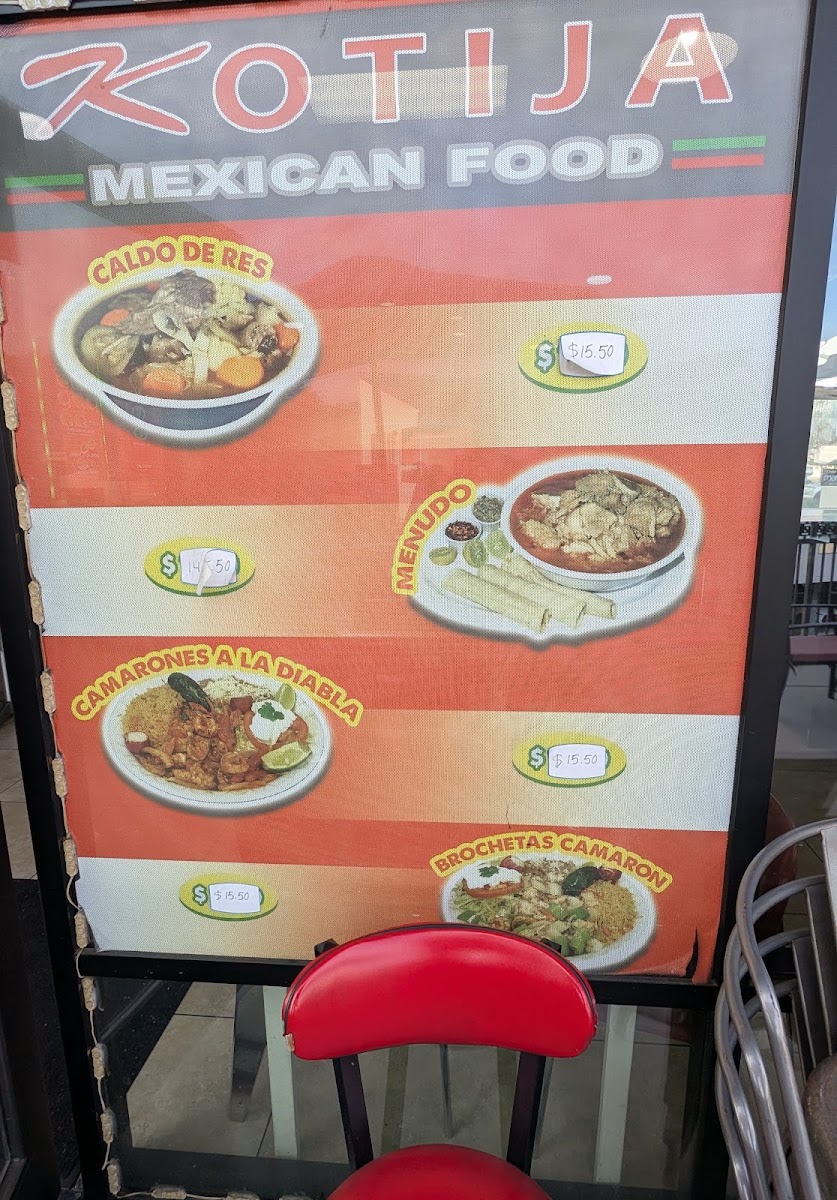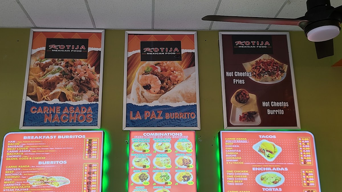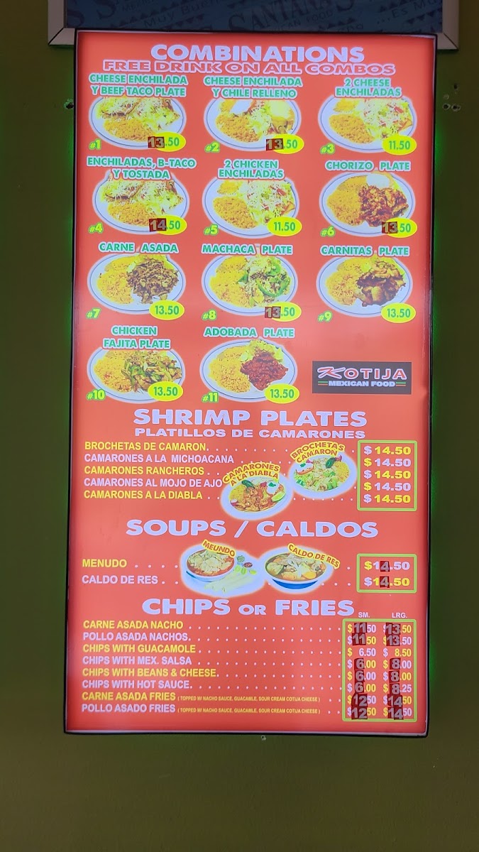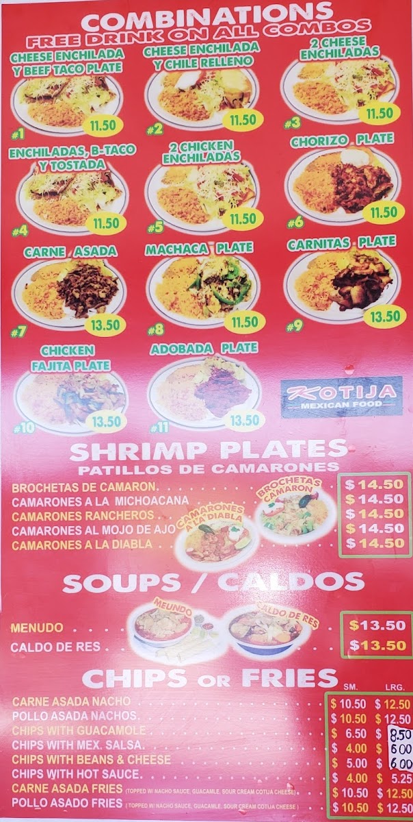 The menu at Kotija Mexican Food offers a delightful array of traditional Mexican dishes, perfect for a satisfying meal at any time of the day. For those seeking a refreshing drink, options include Arizona Tea, Dr. Pepper Can, and Jarritos - Tangerine. The tostada selection features Carne Asada Tostada and Chicken Tostada, while their hearty salads such as the Pollo Asado Salad and Carne Asada Salad are perfect for lighter fare. For a more indulgent option, try the Carne Asada Fries or Pollo Asado Fries, both served with flavorful toppings. The Camarones Rancheros Plate and Camarones Al Mojo De Ajo Plate are standout shrimp dishes, offering vibrant, spiced seafood combinations. If you're in the mood for a filling burrito, the Carne Asada Burrito or Shrimp Burrito are excellent choices, while the Chille Relleno Burrito is a spicy, satisfying pick. For breakfast, you can't go wrong with a Ham Breakfast Burrito or the flavorful Huevos Rancheros. The restaurant also features a variety of secret menu items like the Fish Taco Special and 3 TJ Taco Special for those looking to try something different. Don't forget to pair your meal with crispy chips or a tasty Chimichanga. Whether you're after a quick snack or a full meal, Kotija Mexican Food provides a flavorful experience with something for everyone.