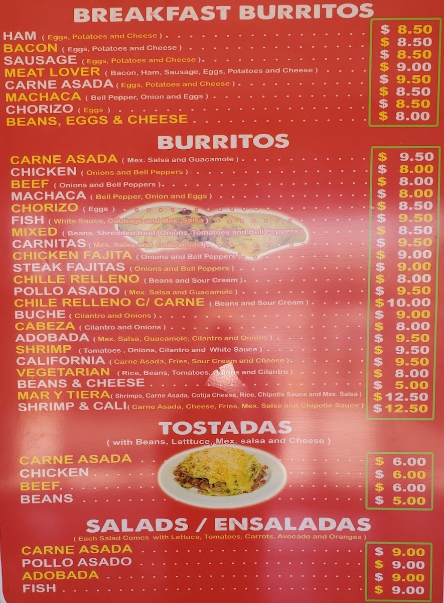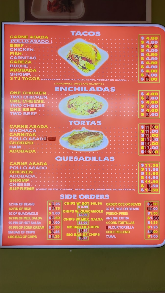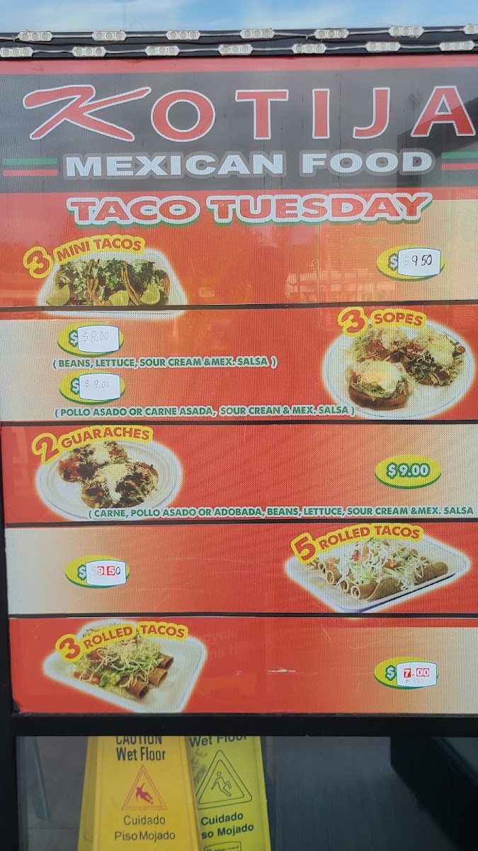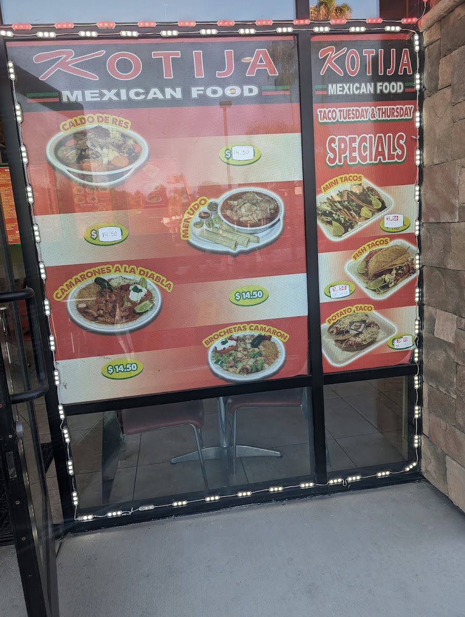 The menu at Kotija Mexican Food offers a delightful array of traditional Mexican dishes, perfect for a satisfying meal at any time of the day. For those seeking a refreshing drink, options include Arizona Tea, Dr. Pepper Can, and Jarritos - Tangerine. The tostada selection features Carne Asada Tostada and Chicken Tostada, while their hearty salads such as the Pollo Asado Salad and Carne Asada Salad are perfect for lighter fare. For a more indulgent option, try the Carne Asada Fries or Pollo Asado Fries, both served with flavorful toppings. The Camarones Rancheros Plate and Camarones Al Mojo De Ajo Plate are standout shrimp dishes, offering vibrant, spiced seafood combinations. If you're in the mood for a filling burrito, the Carne Asada Burrito or Shrimp Burrito are excellent choices, while the Chille Relleno Burrito is a spicy, satisfying pick. For breakfast, you can't go wrong with a Ham Breakfast Burrito or the flavorful Huevos Rancheros. The restaurant also features a variety of secret menu items like the Fish Taco Special and 3 TJ Taco Special for those looking to try something different. Don't forget to pair your meal with crispy chips or a tasty Chimichanga. Whether you're after a quick snack or a full meal, Kotija Mexican Food provides a flavorful experience with something for everyone.